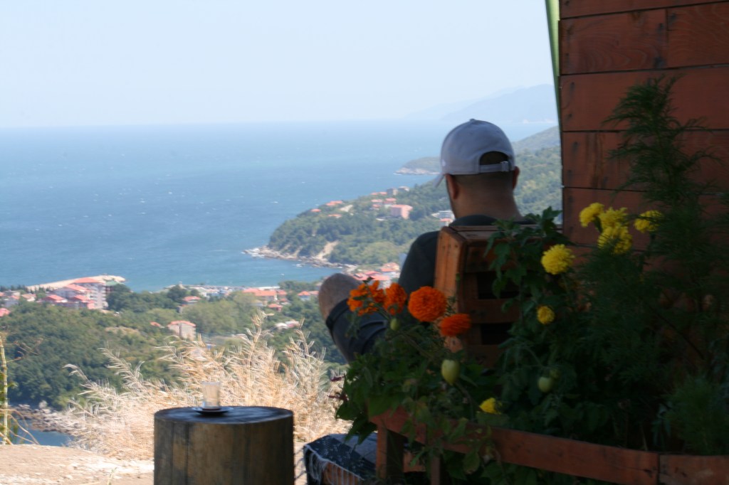 İşte tam da o anlardan birinde, Kurucaşile üzerinden geçerken neredeyse Sinop’a kadar tüm sahil şeridine hakim bir tepede kurulu, instagram hesabı “seyirtepee” olan “kahvekokuluev” mahlasını kullanan mekana rastladık. Gerçekten çok sıcak ve samimi olan işletme sahibinin reklamını yapmadan yazımı yazamazdım. Dışarıdan özel mülk mü yoksa halka açık bir işletme mi olduğu tam olarak kestirilemiyordu. Herhangi bir tabelasının olmaması özel mülk olduğuna dair kanıları kuvvetlendirirken, bahçesinde bir çok masa oluşu tersi görüşü destekeler nitelikteydi. Bu tartışmaya hiç girmeden eyleme geçtik ve belki hayatımızın en güzel mola yerinde, en güzel çayını, en güzel manzarasına karşı yudumladık. Ruhunu alıp doğayla harmanlayan o sert rüzgarın insanın cildinde bıraktığı o özgürlük hissi, hala taptaze olarak hafızalarımda. İşletmenin sahibi hanımefendi oldukça dışa dönük ve konuşkandı, orada geçirdiğimiz iki saatin nasıl geçtiğini anlamadan ayrıldık.
