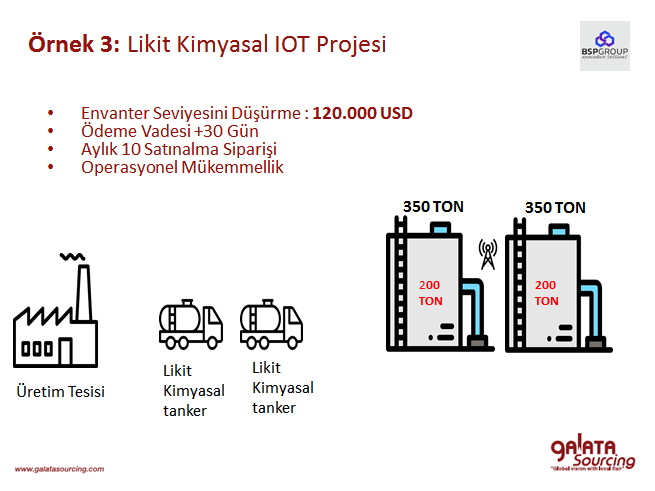 Normalde işletme ihtiyaç durumuna göre düzenli olarak sipariş geçiyor ve kendi tanklarında 500-600 Ton stok tutuyor, stok azaldığında kontrol edip tekrardan sipariş geçiyor. Modelimizde ise işletme ile tedarikçisi uzun dönemli bir anlaşma yapıyor ve kendi stok tanklarını tedarikçiye kiralıyor, yetmiyor tedarikçi teknolojiyi de kullanarak tank stok seviyesini ölçen IoT cihazları ile, stok seviyesi kritik stoğun altına düşer düşmez kendisi gerekli miktarı teslim ediyor. Burada işletme hem operasyonel sipariş yükünden kurtuluyor hem de envanterini ciddi oranda azaltıyor hem de ödeme vadesi ortalamada 30 gün kadar uzuyor.