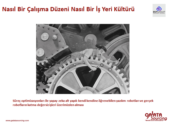 Bu slayt ile başlayan ve devam eden üç slaytta vermek istediğim mesaj çok net, eğer insanlar çarkların arasında eziliyorlarsa, kendilerini güvende hissetmiyorlarsa, her gün kaldıramayacakları çoklukta rütin katmadeğersiz işlerde boğuluyorlarsa onlardan iyileştirme ya da tasarruf projeleri çıkartmalarını beklemek hayalcilik olur.