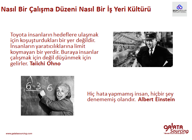 Öncelikle çalıştığımız ortamı iyileştirmemiz gerekiyor ki oradaki tohumlar yeşerebilsinler, eğer iş yeri kültürümüzü Toyota kültürünün mimarlarından Taiichi Ohno nun dediği gibi düşünülecek, keyif alınacak, icat çıkarılacak bir kültüre dönüştüremezsek. Maalesef doğal seleksiyon sonucu ya hazin son ile karşılaşır ya da en iyi ihtimal ile piramidin en altında üstekilerin çamura bulanmaması için birer basamak oluruz.