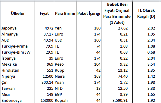 Ülke olarak odaklanmamız gereken nokta bebek bezi fiyatları olmamalıdır. Odaklanmamız gereken nokta gelirimizi nasıl arttırabiliriz? Nasıl satın alma gücümüzü arttırırız? Nasıl daha katma değerli ürünler üretebiliriz? Dünyaya nasıl daha fazla mal, hizmet, bilgi ihraç edebiliriz olması gerekiyor? Bazı üreticilerimiz aslında %100 hastalık tayin eden yerli bebek bezi, ergonomik bebek bezi gibi dünya çapında fark yaratan başarılara imza atmış durumdalar. Bebek bezi kalitesine ve fiyatlarına güvenin. Özgür hocamın dediği gibi aslında fiyatları satın alma gücü paritesine göre de değerlendirmek gerekiyor ama şimdilik moralimiz bozulmasın diye o çalışmaya girmiyorum. Aşağıdaki çeşitli ülkelerdeki bebek bezi fiyatlarının kıyaslamasını görebilirsiniz. Ülkemizde çok şaşırtıcı olarak insanlar, hangisi daha ucuzsa o beze yönelmektedirler. Bu sebeple pazar paylarına baktığımızda uygun fiyatlı bezlerin pazar paylarında ciddi artışlar gözlenmektedir.
